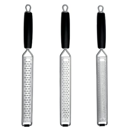 This grater has razor-like cutting blades for effortless grating of foods. The fine grater zests lemons and limes in seconds, grates Parmesan and other hard cheeses light and fluffy, finely grates nuts for baking and decorating, and purées garlic and ginger instantly. The coarse grater chocolate and shred coconut for baking and decorating, grate vegetables to perfection, grate Parmesan and other hard cheeses. The extra coarse grater grates soft cheese quickly and easily, grates Parmesan and other hard cheeses light and fluffy, and easily grates raw horseradish. The rasp-style grater features etched stainless steel cutting blades in a long, narrow stainless steel frame with a rubberized handle and a non-slip rubber base for resting on the countertop.